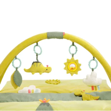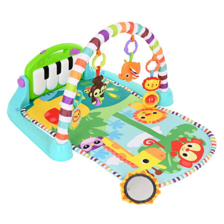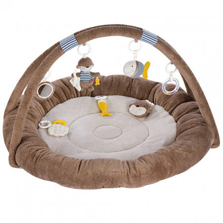 Многофункциональный развивающий коврик состоит из интересных и полезных детям элементов: шуршалки, прорезывателя, погремушки, пищалки, безопасного зеркальца и колечка для захвата. Детали съёмные и выполнены из различных фактур, помогая юным исследователям знакомиться с окружающим миром.